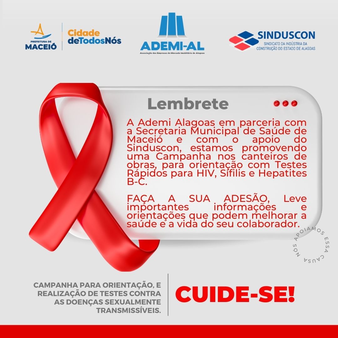 Para estimular ações de prevenção às infecções sexualmente transmissíveis, AIDS e outras doenças a ADEMI ALAGOAS, junto a Secretaria Municipal de Saúde, por meio do Programa IST/AIDS/HIV, deu início ontem (01), a Campanha de Orientação Preventiva sobre as Infecções Sexualmente Transmissíveis e Hepatites Virais, no canteiro de obras da Construart.